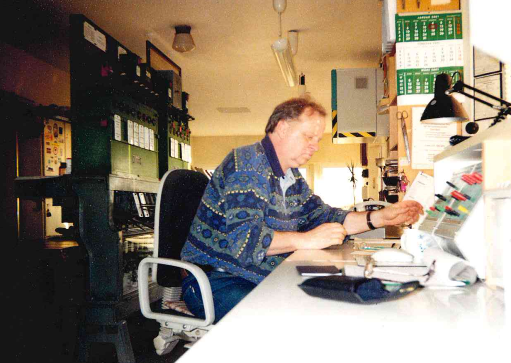 Von 1990 bis 2005 arbeitet Bernd K. als Fahrdienstleiter bei der Deutschen Bahn. Hier ist er an seinem Arbeitsplatz, 2001.